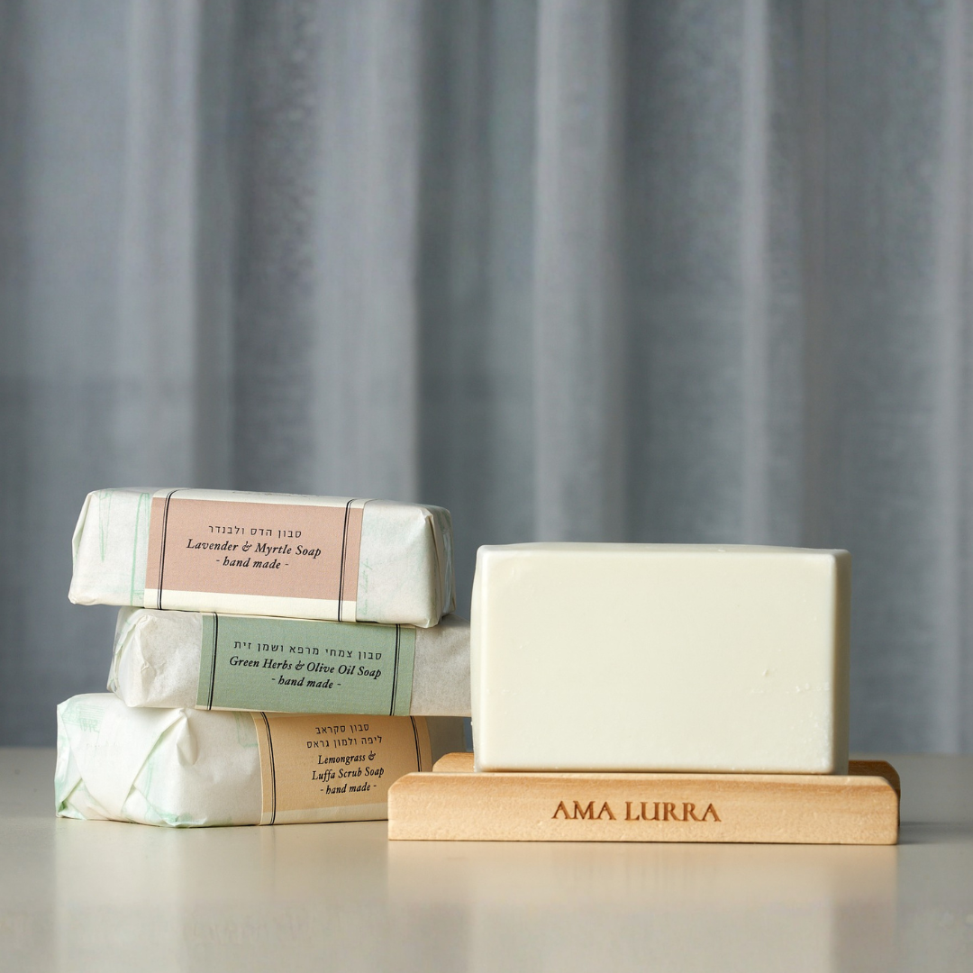 מארז ארבע סבונים 100% טבעיים במחיר מיוחד ומוזל בתוספת סבוניה מעץ מלא לשמירת חיי אורך המדף של הסבון